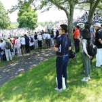 今回から、参加者にはインカム(イヤフォンを通じて解説がきけるもの)が配られ、谷山プロの解説を聞きながら観戦できるようになった。最初に訪れたドライビングレンジでは、プロのクラブ選びや帯同しているトレーナーの役割など、テレビなどでは知ることができない話を披露。また、パッティンググリーンでは、トーナメントでのグリーンの速さについてなどの解説があった。