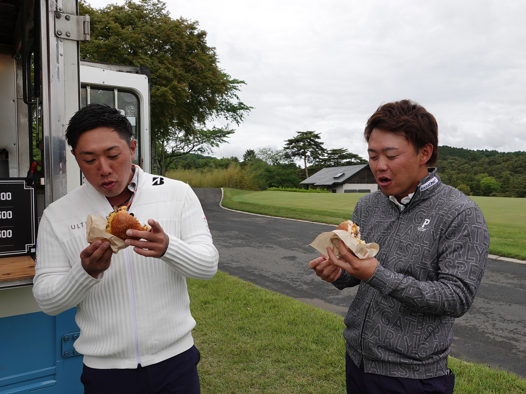 「Chronic Burger」のチーズバーガーを食べる堀川選手と木下選手。