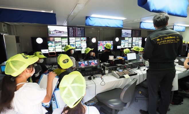 まず最初に、2番ホールティーの奥に設置されたNHK放送センターに移動。NHKのチーフプロデューサーが直接子供たちにテレビ局の仕事を説明しました。トーナメント中継を行うためのスタッフが200名近くいることや、開幕の1週間くらい前から放送のための準備を行なっているなどの説明がありました。
