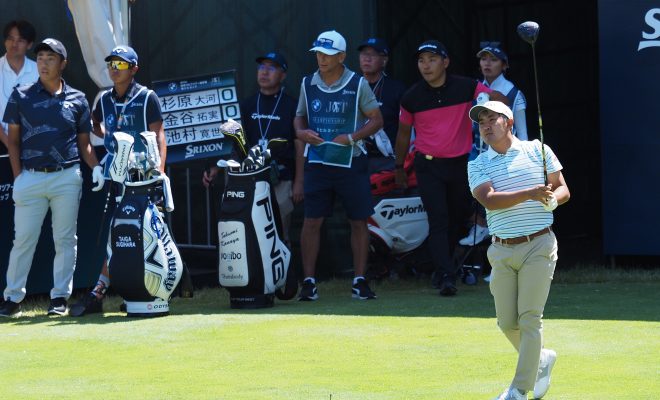 7アンダーでトップに並んだのは金谷拓実(25歳)と米澤蓮(23歳)でした。7アンダー、ノーボギーのラウンドをした金谷は、「宍戸ヒルズはすごく難しいコースなので、ノーボギーの7 アンダーで回れたことは自信になります」と胸を張りました。米澤は8バーディ、1ボギーでのラウンド。「パッティングが良かったですね。すごくパットが入ってくれて、タッチも合っていました」と宍戸のグリーンを克服しました。