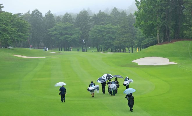「BMW 日本ゴルフツアー選手権 森ビルカップ2023」の2日目、未明から雨が降り続いていますが予定どおり6時10分に第1組がスタートしました。
