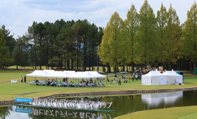 1番ホールティと18番ホールグリーンの様子を一望できる広々としたエリアにあるギャラリープラザ。大きなテントが立てられており、ギャラリーの皆さまは観戦の合間にこの場所でゆったりと寛いでいます。