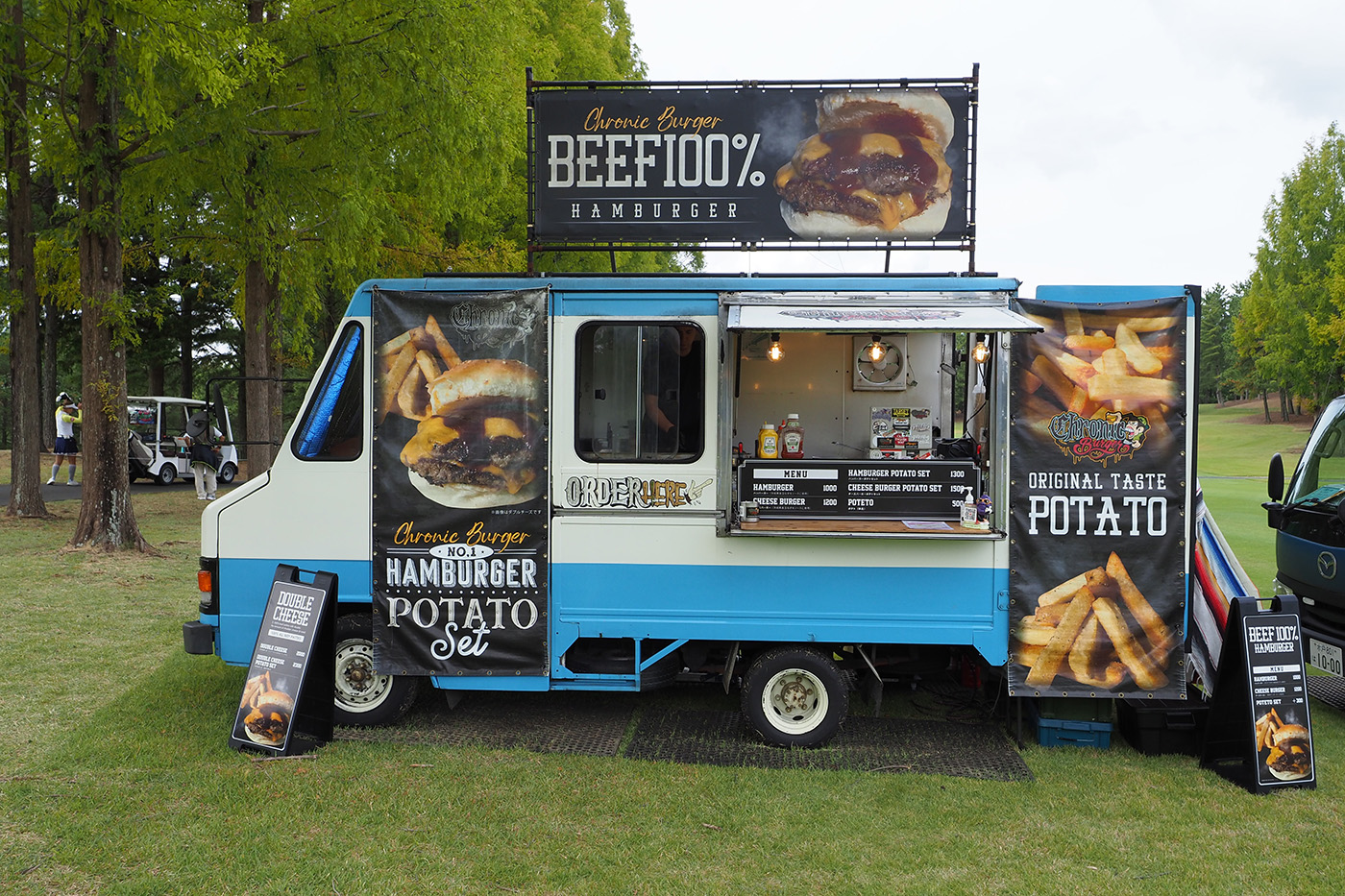 6月に宍戸ヒルズで開催された「BMW日本ゴルフツアー選手権森ビルカップ」にも出店。「ツアー選手権では事前に堀川未来夢選手のYouTubeに取り上げていただいたおかげで、多くの方が堀川選手が食べていたダブルチーズバーガーを注文。途中で完売になってしまいました」とのことでした。また、バーガーバカという笠間市のグルメイベントでは2時間待ちだったという大人気のハンバーガーです。
