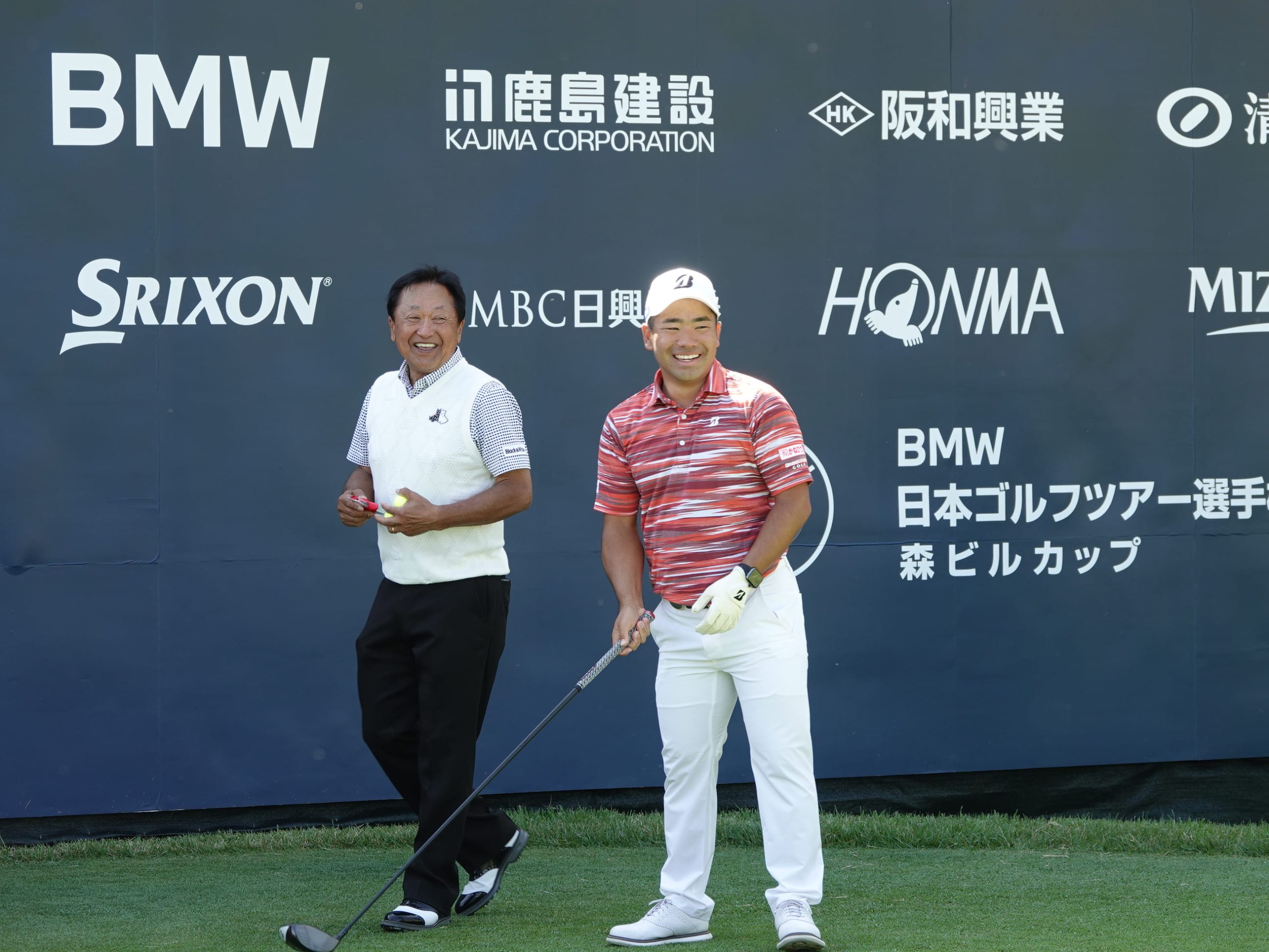 日本ゴルフツアー機構(JGTO)副会長の倉本昌弘氏(左)と談笑する2022年覇者の比嘉一貴選手