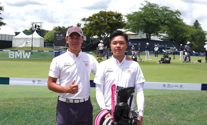 今年唯一のアマチュア・隅内雅人(左)。キャディーは日大の同期で寮では同部屋だという吉田京介さんが行う
