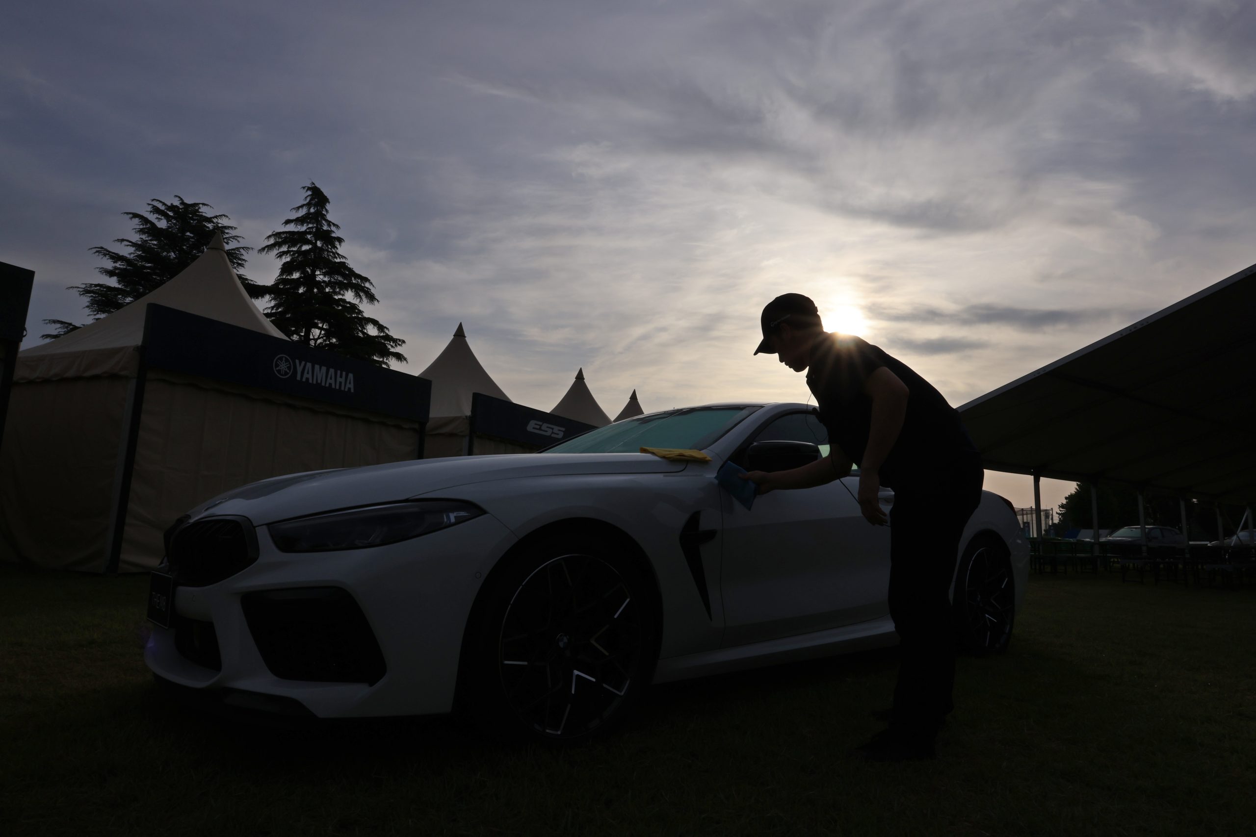 展示しているBMWを丁寧に拭きあげるスタッフ