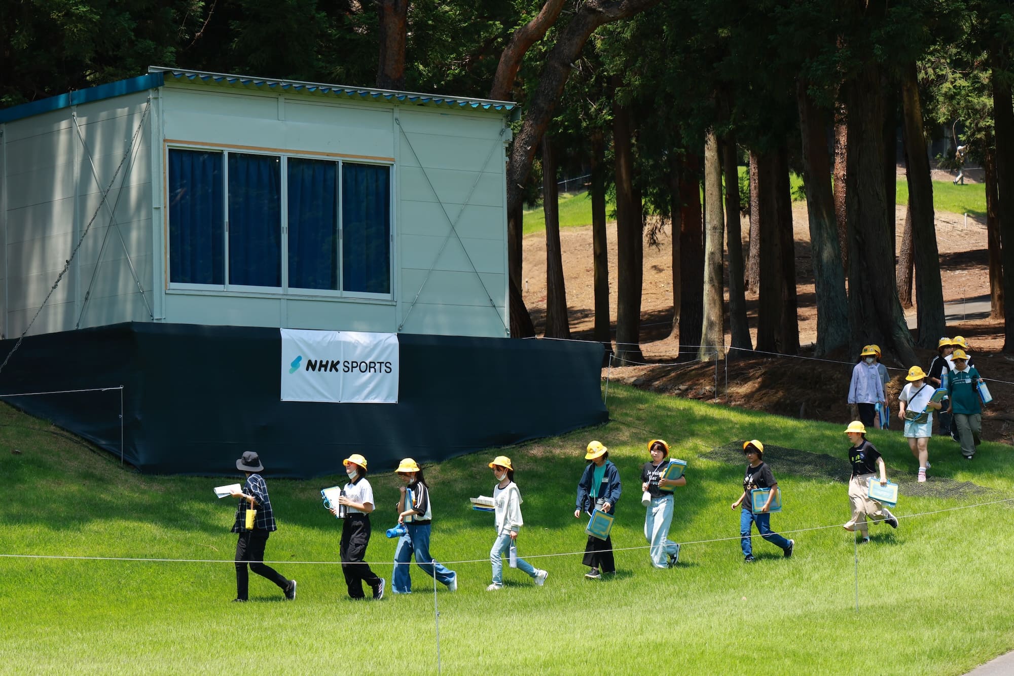 ゴルフトーナメントを観るのが初めてという子も多く、プロの力強いショットが放たれるたびに大きな歓声が上がりました。NHK放送センターでは、普段は見ることのできない番組制作の舞台裏の説明に、子どもたちは興味津々の様子で耳を傾けていました。