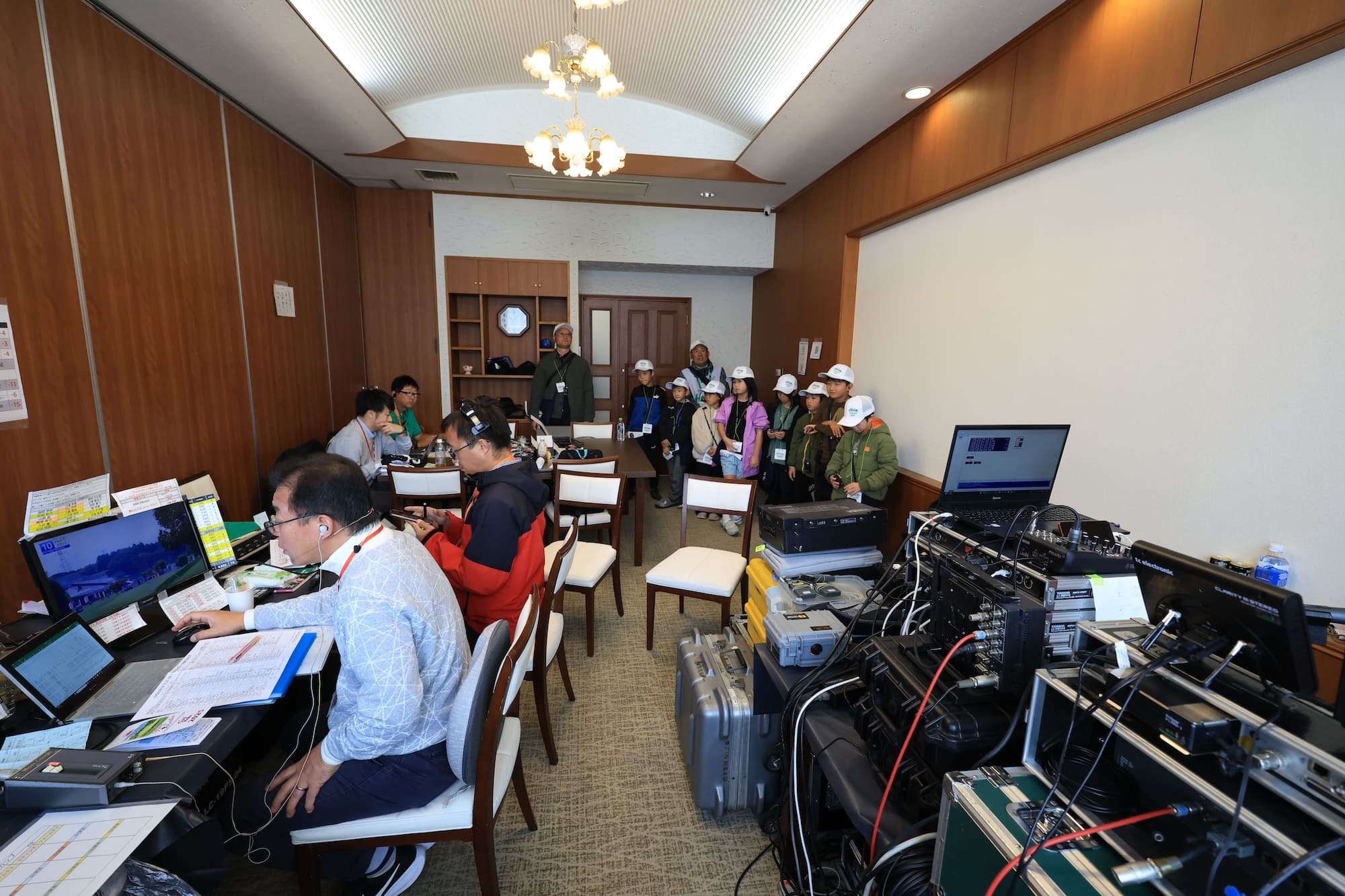 さらに、CS放送「スカイA」の放送ルームを見学したほか、「お静かにお願いします」のボードを掲げてギャラリー整理を行うマーシャルの仕事も体験。ゴルフトーナメントの裏側に触れながら、運営の仕組みについても学びました。