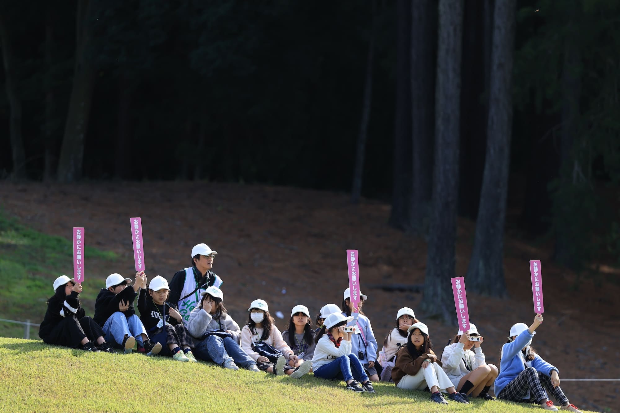バスで到着した生徒たちは、まずオリエンテーションで説明を受けた後、さっそくトーナメント観戦を開始。ゴルフ場を訪れるのが初めてという生徒も多くいましたが、各班にはディレクターが付き、トーナメントの仕組みやゴルフのルール、プレーの見方などを解説したため、生徒の皆さんは楽しそうに観戦していました。選手たちの素晴らしいショットには「わあ、すごい!」と歓声が上がり、ショットの際には静かに見守る、好プレーには拍手を送るといった観戦マナーも自然と身についていました。