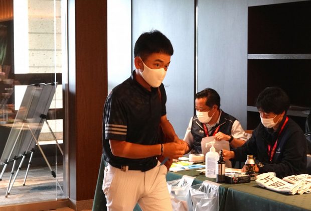 初日6アンダーで単独トップ立った竹谷佳孝選手が入場 選手はプレー以外ではマスクをつけて毎日検温を実施