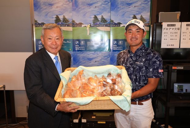 会見の最後に諸星裕会長と金谷拓実選手のフォトセッションを実施。持っているのは開催コースである宍戸ヒルズカントリークラブの名物であるパン 公式記者会見:「ギャラリーの皆さんにもワクワクして見て欲しい」金 […] -