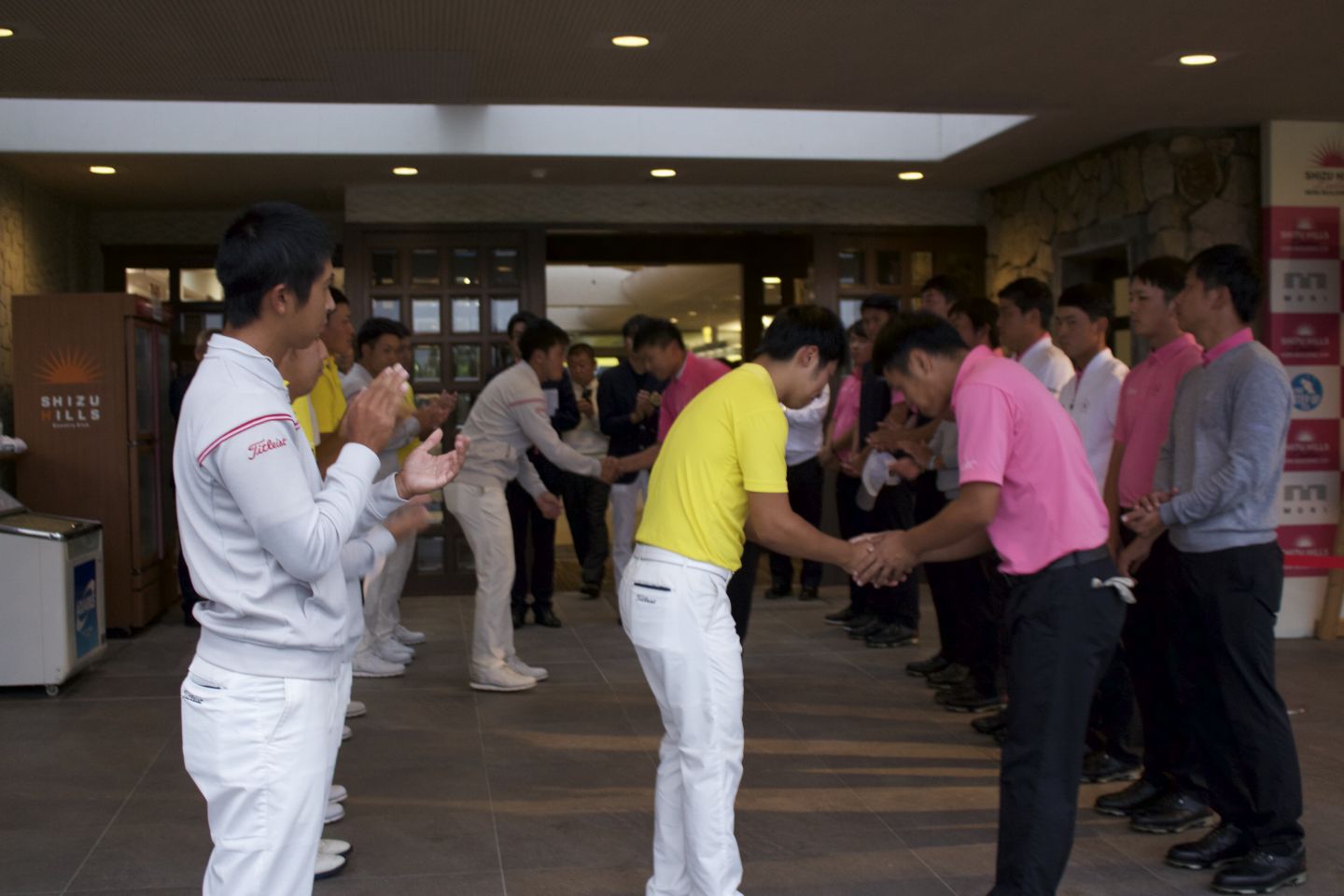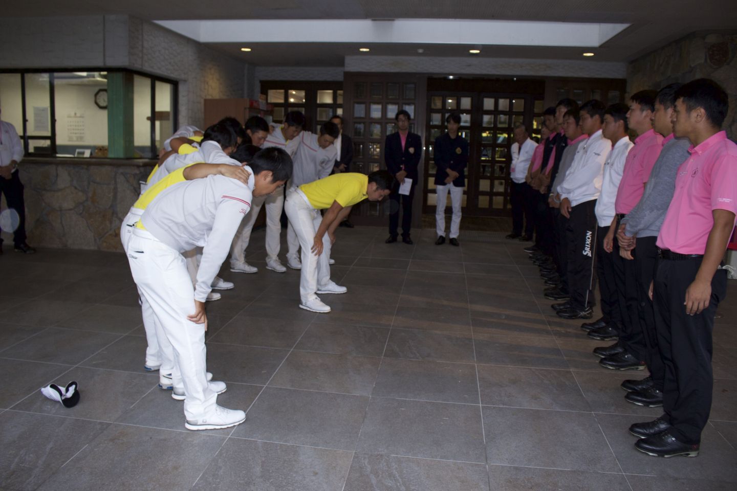 対戦が終わった後はお互いの健闘を称えエール交換。薄暗くなりつつあったゴルフ場に、両校代表の声が響きわたります。大学対抗戦ならではの光景です。