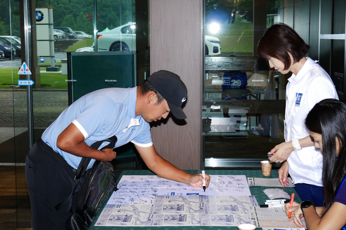 クラブハウスのエントランス付近では、来場してきた選手が各々サインを書いていた。予選ラウンドの2日間書いてもらい、全選手のサインが書かれた紙の一枚は、宍戸ヒルズカントリークラブの一階エントランス近くの談話室に飾れている。