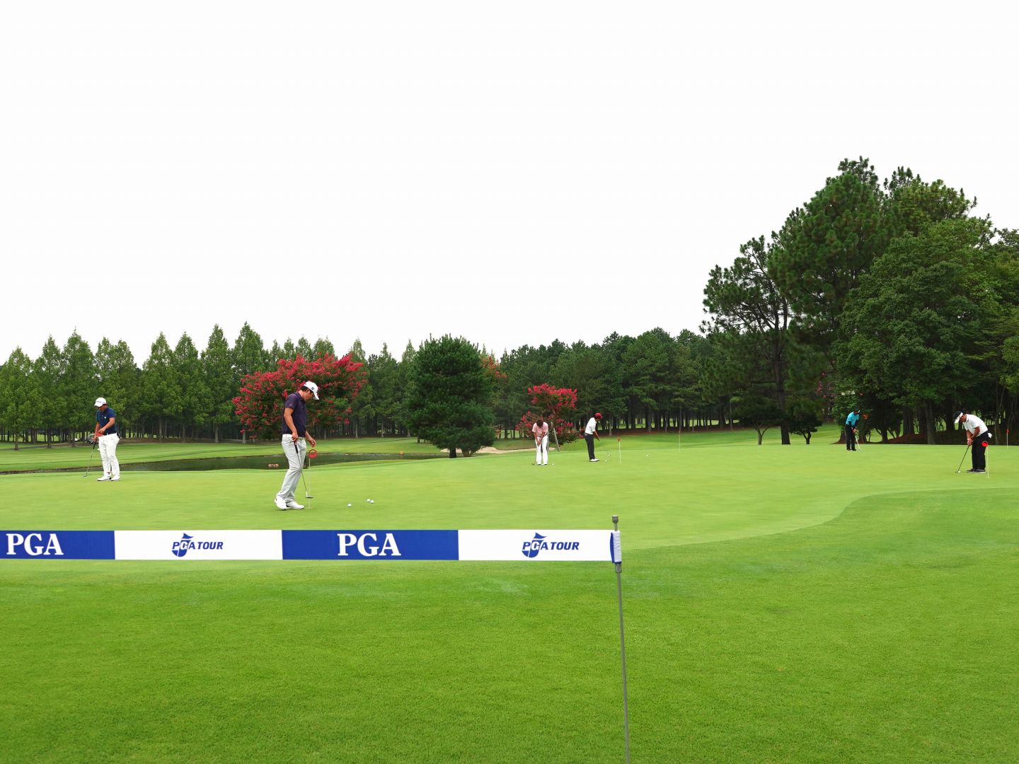 スタート前にアプローチの練習を行う選手たち。傾斜のライや深いラフなど、ラウンド中を想定した様々なライから練習を行っています。グリーンは本グリーンと同じコンディションです