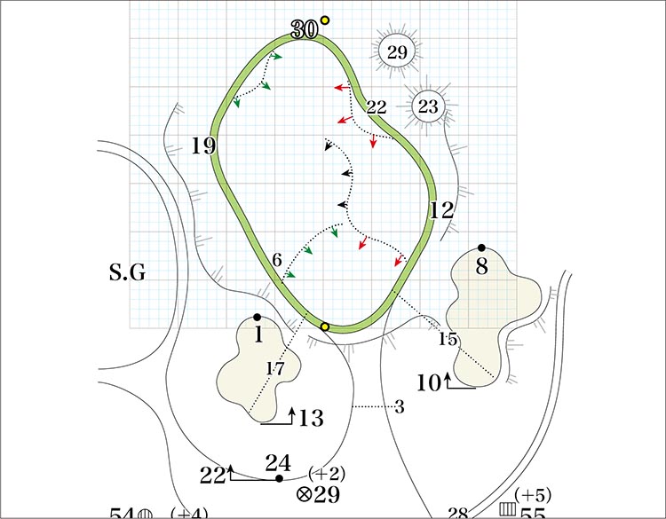 第1打はクロスバンカー左サイドがベストポジション。グリーンの傾斜が強いので、手前から攻めるのがよい。