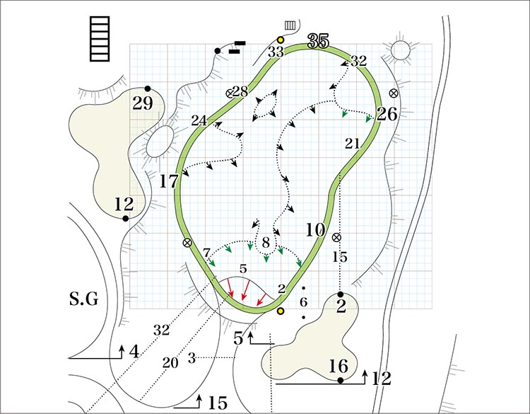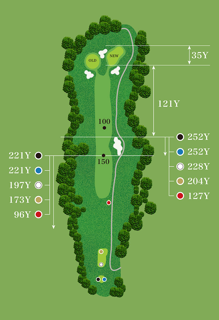 第2打は手前のガードバンカーに入らないようワンクラブ大きめに。グリーン上は下りのパットに注意。