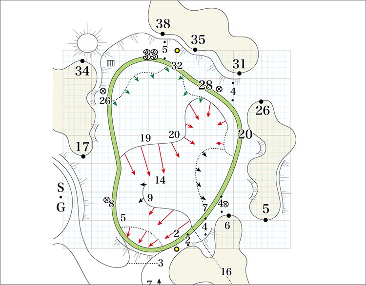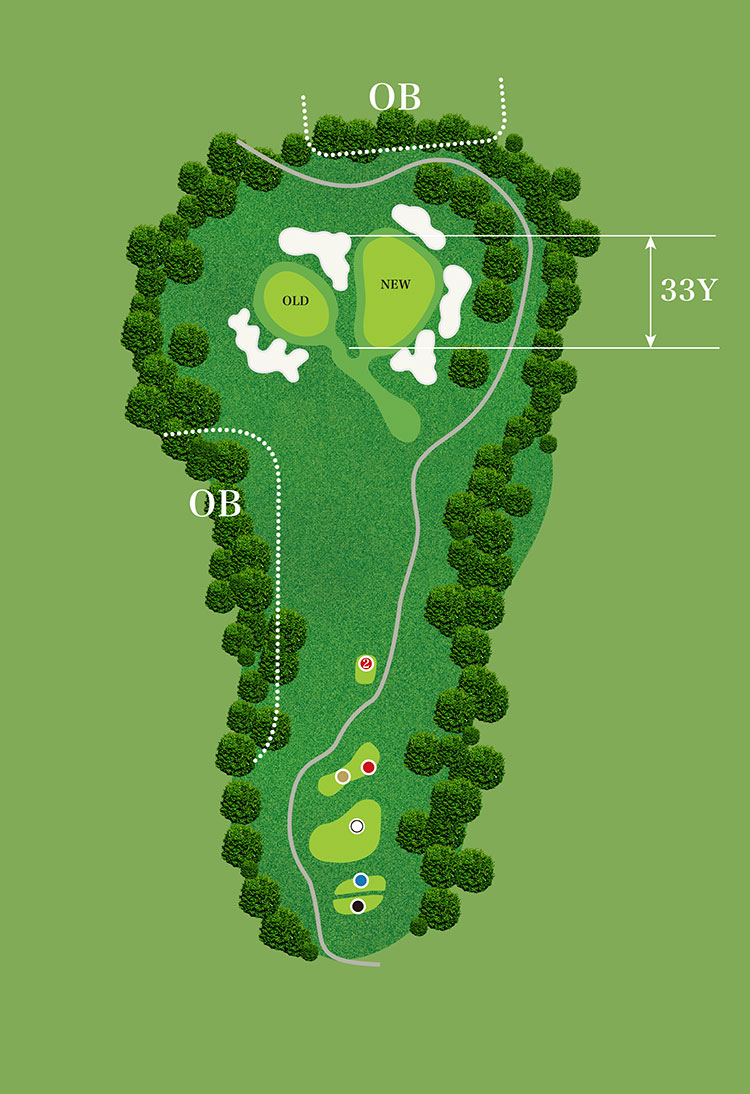 打ち下ろしのショートホール。左グリーンは左、右グリーンは右が禁物。グリーンの上は風が吹き抜けるので、風向きに注意。