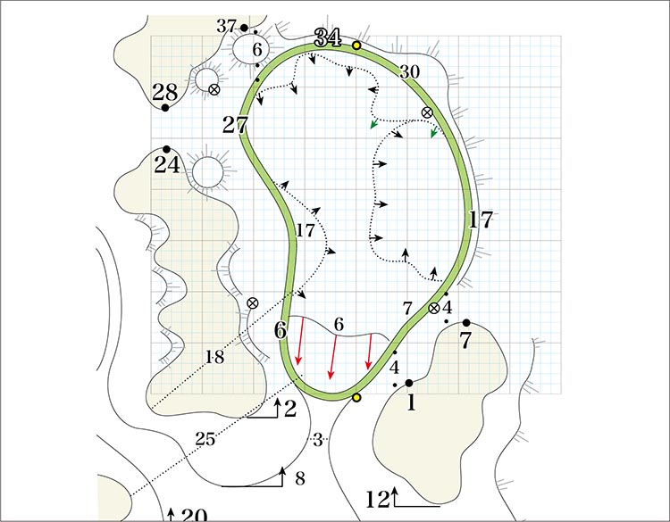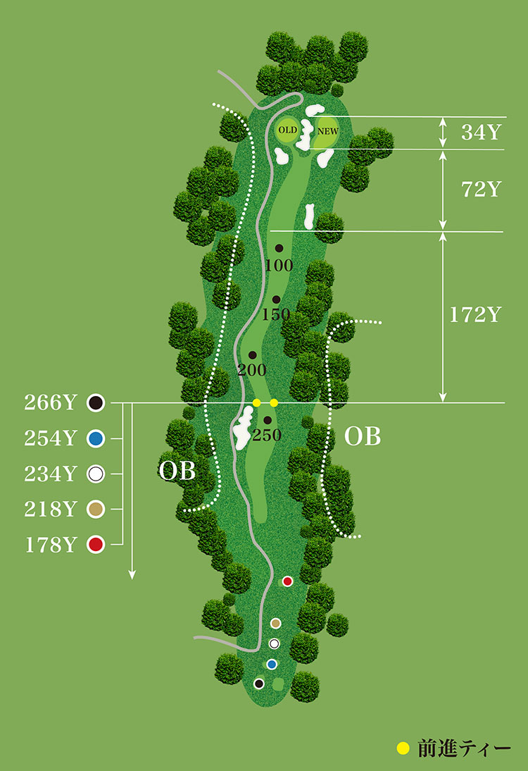第1打は左右にOBがあるが、特に右は禁物、セーフでも第2打が狙えない。第2打以降も右は大トラブルあり。右手前へ傾斜のグリーン。のぼりのラインにつけたい。