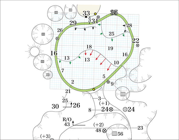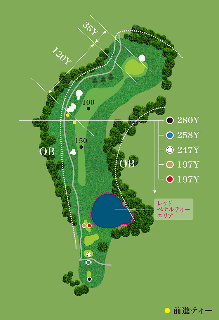 右ドッグレッグのPar4。FWが大変狭いので、ティーショットはしっかりとFWをキープしたい。グリーン中央から右サイドにかけて傾斜が強い。ピン位置を確認して、傾斜を考えた位置にグリーンヒットしたい。