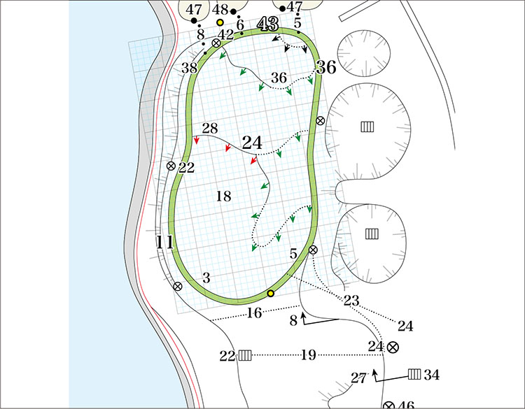 FW左サイド250ヤード地点に池があり、3Wでティーショットする選手が多い。しっかりとFWを確保したいティーショットとなる。グリーン左サイドに池があり、勇気を試されるショットとなる。2段グリーンのため、奥の段の左サイドにピンがあるときは大変難しい。