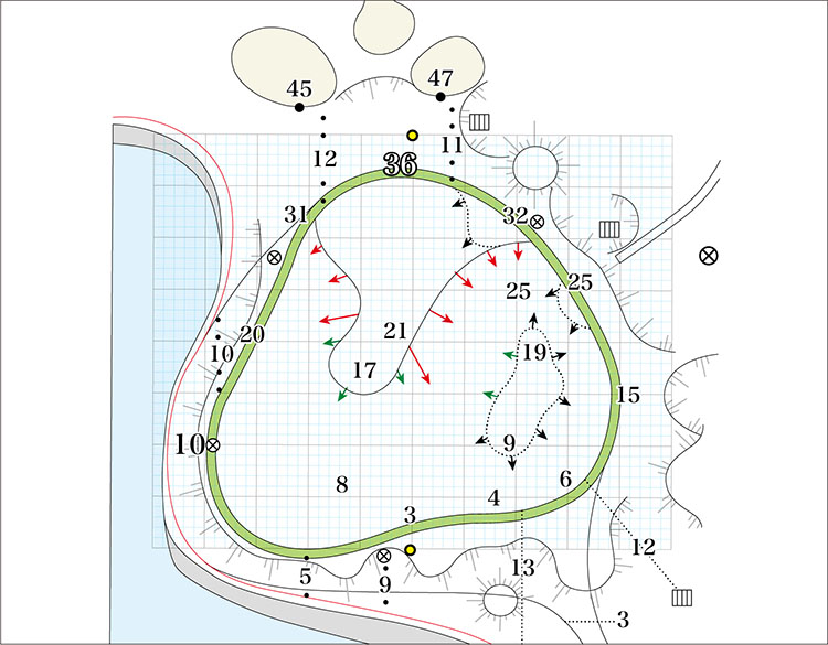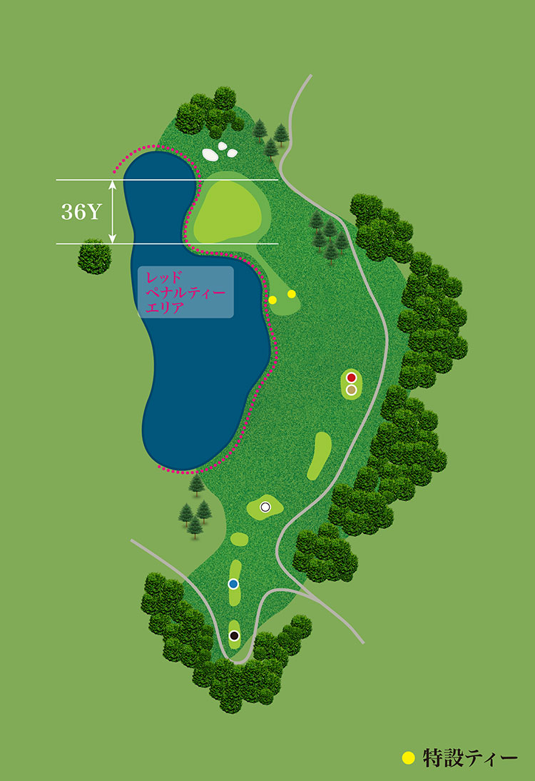 宍戸ヒルズ、アーメンコーナーの始まりです。一番後ろのティーからは、220~240ヤードの距離の長いPar3となる。左サイドにピンがある場合、手前だけでなく、奥の池にも注意。