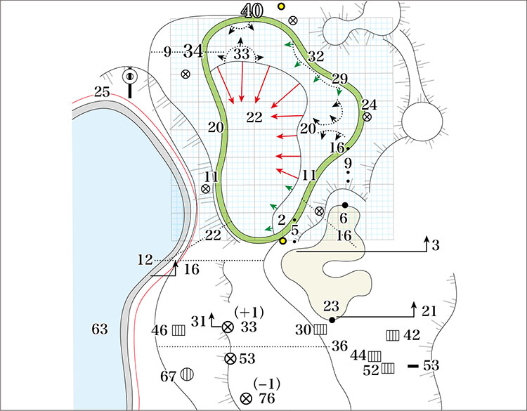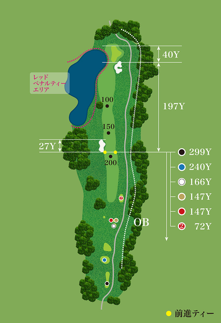 2015年、平均ストロークが4.369と、2番目に難しかったホール。距離も505ヤードと大変長い。ティーショットは右サイドは禁物だが、左サイドもバンカーがあり難易度が高い。グリーンの左には池、またグリーン含め全体が左サイドに傾斜しているため難易度の高いホール。左右に段が分かれ、また奥にもコブがある。ピン位置によっては、右手前のバンカーもOK。