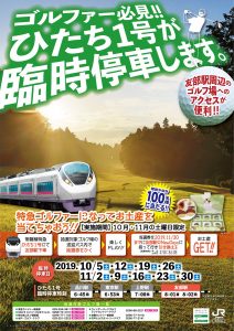 特急 ひたち1号を利用するゴルファーを対象としたキャンペーン!日 程 10月 5日(土)、12日(土)、19日(土)、26日(土) 11月 2日(土)、9日(土)、16日(土)、23日(祝)、30日(土) 特 典 バスの中で抽選、期間中100名様にお土産が当たる 11月30日までにNewDays友部店(JR友部駅)限定で、当選券とお土産をお引換ください。 |