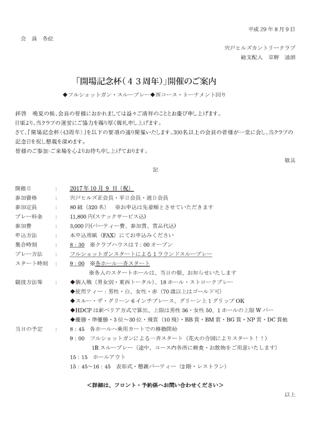 43周年 開場記念杯開催おかげさまで宍戸ヒルズは、開場43周年を迎えることとなりました。 日頃よりご支援ご協力をいただいている会員の皆様に、さらに懇親を深めていただけるよう下記の要項通り43周年開場記念杯を開催いたします。