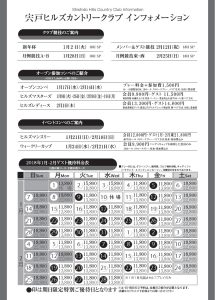 コンペ開催日程宍戸ヒルズオープンコンペ日 程 1月17日(水)・2月14日(水) 料 金 会員:11,400円 ゲスト:プレー代+参加費1,500円 競技方法 ぺリア方式(18ホールストロークプレー) ヒルズレディース日 程 2月1日(木) 料 金 会員:13,300円 ゲスト:14,800円 ※参加費込 競技方法 新ぺリア方式(18ホールストロークプレー) ヒルズマスターズ日 程 1月9日(火)・26日(金)・2月9日(金)・19日(月) 料 金 会員:9,900円 ゲスト 11,500円 ※参加費込 競技方法 新ペリア(前半9ホールストロークプレー) |
