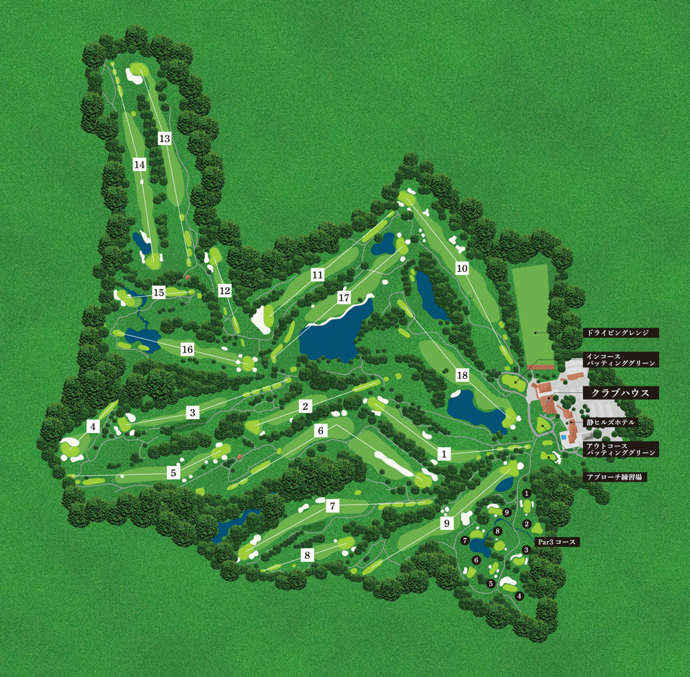 クラブハウスを出た瞬間、眼前にはコースの絶景が広がります。窮屈なコースが多い日本では数少ない、この開放感が静ヒルズの最大の魅力です。設計監修は中嶋常幸プロ。最大高低差7メートルとフラットで広大な敷地を素材に、世界を転戦した経験とイメージを集約させ素晴らしいコースを作り上げています。