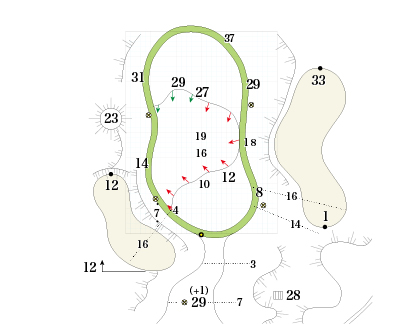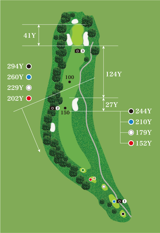 フェアウェイが広く一般ゴルファーが気持ち良くティーショットが打てるスタートホール。ただ、飛距離が出る中上級者は右のバンカーがプレッシャーになっていて、右を嫌って左へ打つと林に入ってしまう。ベストルートは右バンカーの左だ。グリーンは縦長で左右と奥にバンカーがあるが、花道になっている手前から攻めると大怪我はしない。グリーン奥が高くなっている2段グリーンで、全体的に左に傾斜をしている。ピン位置によっては右側にキャリーさせて、傾斜で転がし寄せていきたい。