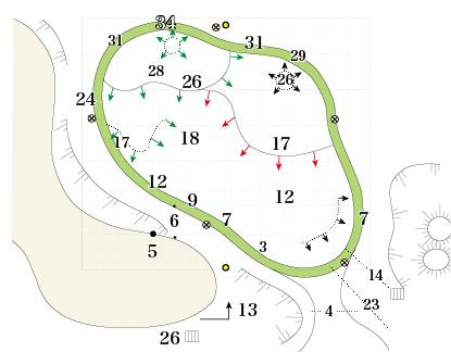 たっぷりと距離があるドラコン推奨のミドルホール。アゲインストの風が吹くと、難易度が上昇する。ティーショットの落下地点にはバンカーも池もないので、しっかりと距離を稼いでいきたい。セカンドショットは左手前の門番のようなバンカーに注意。入れてしまうとパーセーブがかなり厳しくなる。グリーンは広く、右手前に向かって大きく傾斜をしており、ピンの位置を考慮して乗せる場所をしっかり考えて狙っていくことが重要。単なるパーオンだけでは、3パットの確率が高いホールなのでパーセーブは難しい。