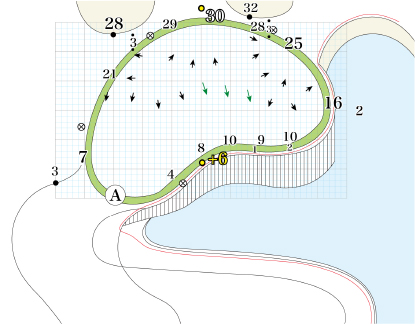 ティーショットは豪快に打てるが、ロングヒッターは右の池に届く可能性があり注意が必要。セカンドショット地点の先にある右サイドの巨大な池が、グリーン手前まで広がっており、ピンが真ん中より右サイトにある場合は池越えのショットとなる。グリーンは池の水面より高く、ピンが手前にある場合は高い球で攻められないとバーディチャンスにつけるのは難しい。池を避けて左サイドの斜面にいくと、左足下がりの難しいアプローチが残りパーセーブが難しくなる。逆転劇の可能性を秘めたクライマックスに相応しい最終ホールだ。