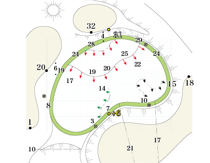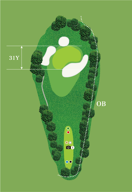 グリーン右手前には壁の高さ約2.3メートルの巨大バンカーが待ち受けており、ピンが右サイドにある時は大きなプレッシャーになる。壁の近くに入れてしまうとグリーンに乗せるのは難しくなるので要注意。さらに、グリーンの奥や左サイドもバンカーが囲んでおり、距離は短いが正確なショットが求められる。グリーンの傾斜もしっかりとチェックした上で、ピン位置に応じた落とし所を定めて狙っていきたい。