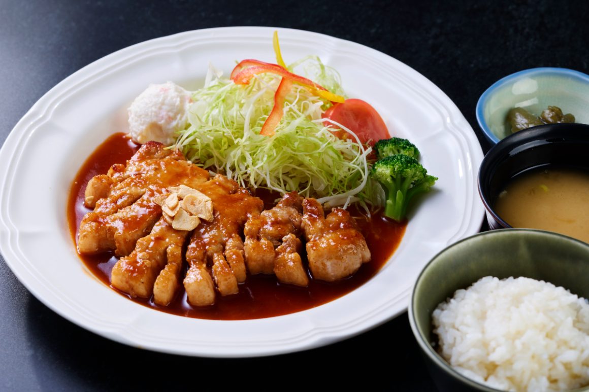 美明豚のロースを約200g使った、ボリューム満点のトンテキ。ウスターソースをベースに、味噌、醤油、フルーツなどをブレンドした甘酸っぱいソースが肉本来の旨みや甘みを引き立てます。ラウンド前後のスタミナアップにもおすすめです。