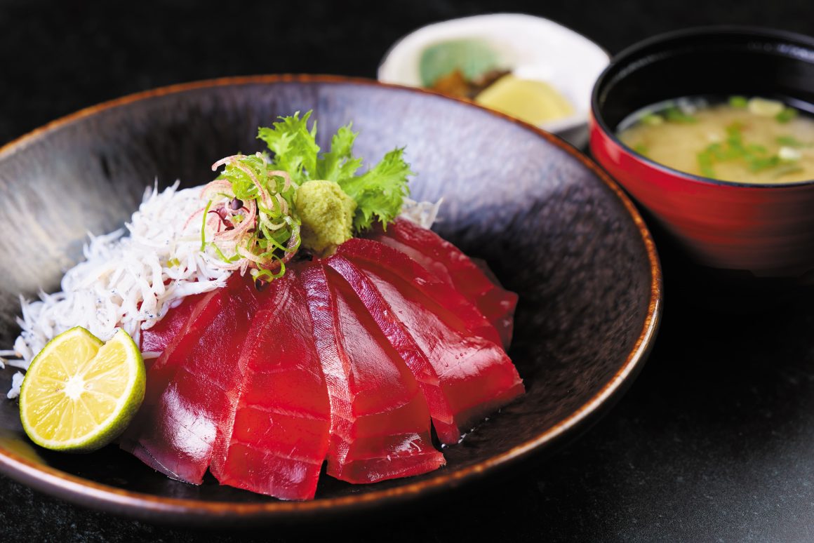 おすすめメニューのひとつ、「鮪しらす丼」は近海物のメバチ鮪と、しらす漁が盛んな大洗産の釡揚げしらすを盛り合わせた丼。茨城県産のコシヒカリが、鮪の旨みとしらすのやさしい塩けを引き立て、シンプルながら満足感のある一品です。