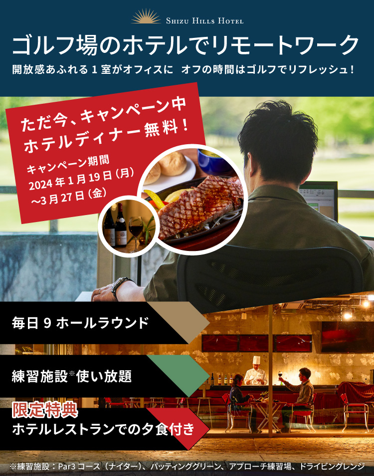 快適なホテルの1室が、あなたのオフィスに。オフの時間はゴルフでリフレッシュ!