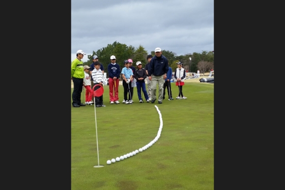 中嶋常幸プロが主催するヒルズゴルフトミーアカデミーの練習風景。パッティングのラインをイメージすることの大切さを、ボールを並べることでジュニア選手に教えています。