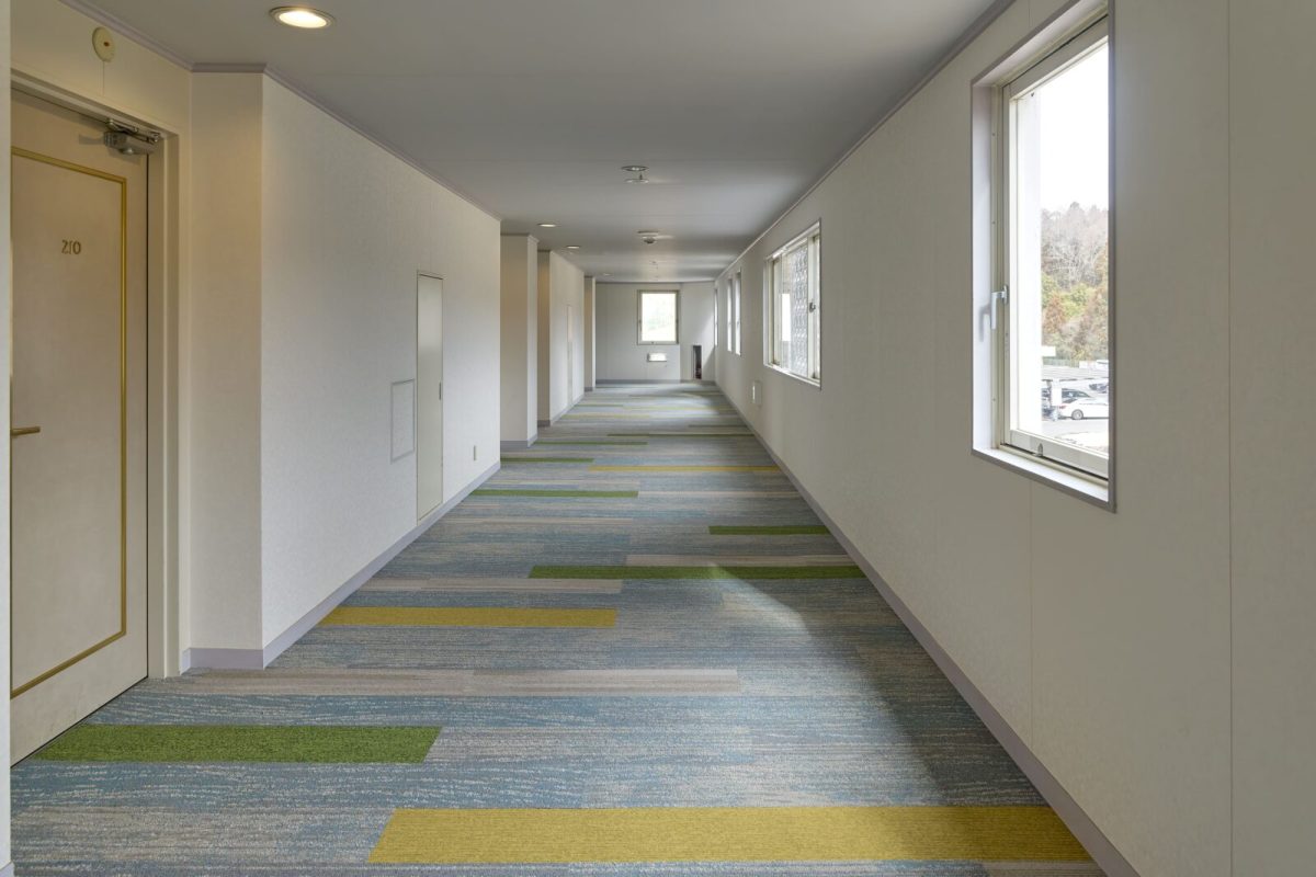 この度、2Fおよび3Fフロアの廊下カーペットをリニューアルいたしました。 モダンなデザインを取り入れ、これまでの雰囲気から一新。より明るく、開放感と落ち着きが調和した空間へと生まれ変わりました。
