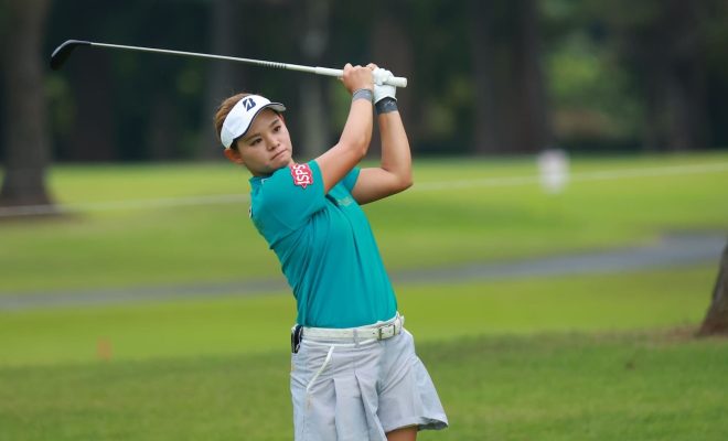 5アンダーの2位タイにはヒルズゴルフトミーアカデミーに所属しているアマチュアの入谷響選手、ツアー5勝を誇るベテランの比嘉真美子選手、そしてプロ入り2年目の池ヶ谷瑠菜選手がつけています。