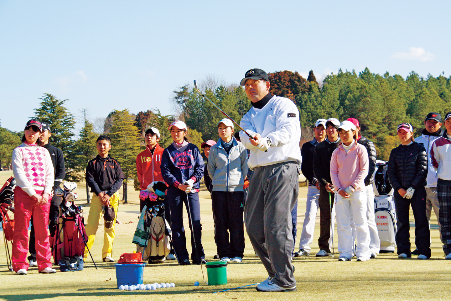 【2013年2月に実施された第1期生の2回目の合宿。中嶋プロのショットを真剣に見つめる中学生の畑岡奈紗選手の姿も】