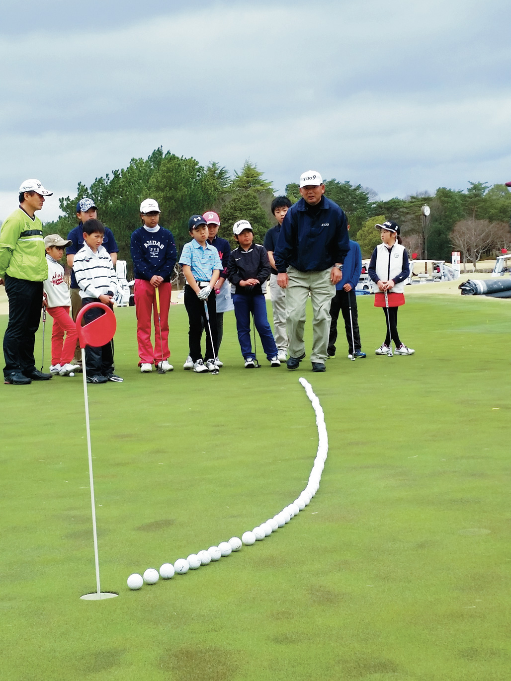 イメージするという行為を教えるのは非常に難しいですが、中嶋プロは様々な方法で生徒たちに"イメージする"という行為を理解させようとしています。例えばパッティングの際は、ライン上にボールを置く事でイメージするということについて教えていました。